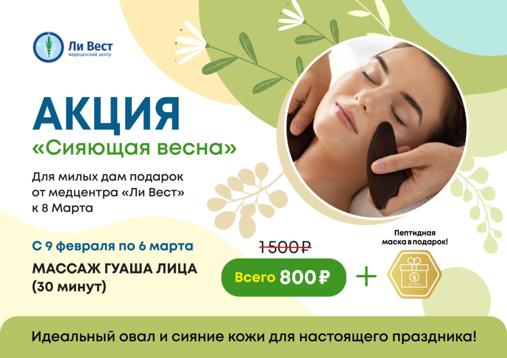 С 9 февраля по 6 марта 2026 года действует специальное предложение — 30-минутный сеанс массажа гуаша лица всего за 800 рублей (вместо 1 500)! А пептидная маска — в подарок!